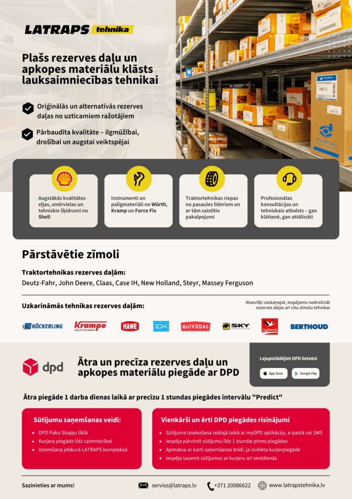 Plašs rezerves daļu un apkopes materiālu klāsts lauksaimniecības tehnikai
